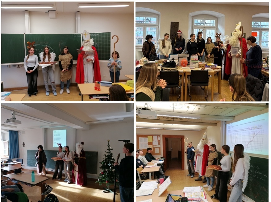 Am Tag vor Nikolaus war bei uns an der Schule eine ganz besondere Stimmung zu spüren: Zwei Nikolaus-Gruppen der SMV zogen von Klasse zu Klasse durch das gesamte Schulhaus. Mit viel guter Laune und weihnachtlicher Atmosphäre sorgten der Nikolaus und seine Begleiter für strahlende Gesichter. In den Klassen wurde der Nikolaus mit Liedern und Gedichten empfangen. Als Dankeschön gab es für jede Klasse ein leckeres Weckmännchen, das natürlich sofort für Begeisterung sorgte. Die Aktion brachte nicht nur Lob und Tadel in die Klassen sowie einen leckeren Schmaus für Zwischendurch, sondern sorgte auch für Freude und ein bisschen Vorweihnachtszauber im Schulalltag. Ein herzliches Dankeschön an die engagierten Mitglieder der SMV für diese gelungene Nikolaus-Aktion!