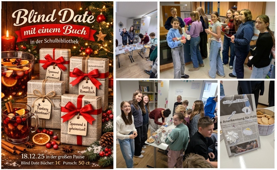 In der Adventszeit 2025 haben wir, die Schulbibliothek, einen Blind-Date-Buchverkauf mit Punsch und leckeren selbstgebackenen (Buch-) Plätzchen veranstaltet. Bei einem Blind-Date-Buchverkauf werden verpackte Bücher verkauft. Man sieht das Cover also nicht, jedoch geben Stichworte Informationen über das Buch preis. Es hat sehr viel Spaß gemacht, inmitten der Vorfreude auf Weihnachten neue Lieblingsbücher zu finden und dabei Punsch und Plätzchen zu genießen.