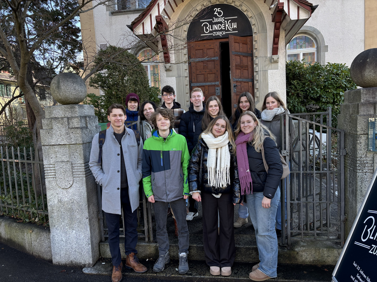 Der evangelische Religionskurs der K 2 unternahm im Januar einen Tagesexkursion nach Zürich. Dort besichtigten die Schülerinnen und Schüler das Fraumünster mit den berühmten Chagallfenstern. Ein Schüler führte in die Reformation in Zürich durch Ulrich Zwingli ein. Anschließend wandelte die Gruppe bei wunderschönem Sonnenschein am See entlang zum Restaurant „Blinde Kuh“. Das weltweit erste Dunkelrestaurant ermöglicht ein besonderes Erlebnis: von einem Blinden wird in kompletter Dunkelheit ein Mittagessen serviert. Viele Fragen (Wie kaufen Sie ein? Welche Hobbies haben Sie? Leben Sie alleine?) stellten die Schülerinnen und Schüler und gewannen so einen Einblick in die Lebensrealität blinder Menschen. Eine kurze Zeit die Welt aus der Sicht von Blinden zu erleben, bedeutet einen Perspektivwechsel und sensibilisiert für eine andere Lebenswelt. Dazu ist das Essen eine aufregende, teilweise auch lustige Herausforderung. Im Anschluss gab es noch die Möglichkeit, die Altstadt eigenständig zu erkunden. Ein lohnenswerter Ausflug, an den wir uns gerne erinnern!